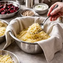 Transfer the grated potato and onion mixture to a clean, thick kitchen towel (muslin, linen towel) or a handkerchief and squeeze out as much liquid as possible. Hold it over a bowl — you can collect the starch that settles at the bottom. After squeezing, discard the drained liquid. Transfer the dry mixture back to a dry bowl.