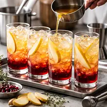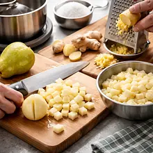 Prepare the syrup: peel the pears and cut the flesh into cubes about 1 cm on each side. Peel and finely grate the ginger (you can leave some thin slices for decoration). In a medium saucepan, combine 400 g of chopped pears, 30 g of grated ginger, 200 g of sugar, and 200 ml of water. Heat over medium heat, stirring with a wooden spoon, until the sugar dissolves (about 4-6 minutes). Reduce the heat and simmer gently for 15-20 minutes, until the pears are soft and the syrup thickens. Use an immersion blender (or transfer to a standing blender) and blend until smooth. Strain through a fine sieve, pressing down with a spoon to obtain a clear syrup (the leftover pulp can be used for dessert). If you want a thicker syrup, continue cooking over low heat for another 5-10 minutes. Finally, add 60 ml of lemon juice, mix, and set aside to cool.