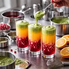 Prepare the syrup: place 220 g of pomegranate seeds (about two-thirds of the prepared seeds) in a medium saucepan, add 200 g of sugar and 150 ml of water. Use a wooden spoon to gently crush the seeds at the bottom of the pot — they do not need to be completely broken down, just enough to release their juice. Set the saucepan over medium-low heat, bring to a gentle boil, and then cook for 10–12 minutes, stirring every minute, until the sugar is completely dissolved and the mixture thickens and takes on an intense, deep color. After cooking, remove from heat, strain through a fine sieve into a clean bowl, pressing the skins and seeds with a spoon to extract as much juice as possible. Add 20 g of lemon juice to the strained syrup and mix. Set aside to cool.