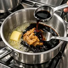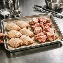 Preheat the oven to 220°C. Place the chicken thighs and pork bones on a baking tray lined with parchment paper. Cut the onion in half (do not peel the outer skin, leave it for color), the carrot into halves, and the leek into 3-4 pieces. Arrange the vegetables next to the meat. Place in the oven and roast for 30 minutes, until the meat and bones are well browned – this is important for the color and flavor of the broth. Check: the surface should have caramel-brown scorch marks, but not burnt black.