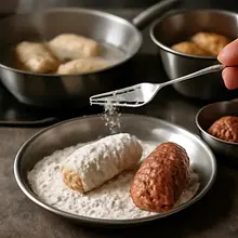 Coat the roulades in flour (50 g): pour the flour onto a plate and lightly coat each roulade, shaking off the excess. In a large skillet, heat 15 g of butter and 15 g of oil. Fry the roulades over medium-high heat for 2-3 minutes on each side, until they are nicely browned (they should have a golden-brown crust). Do not fry for too long — the goal is to brown them, not to cook them through.