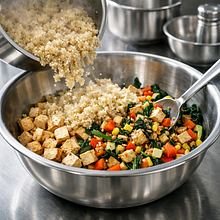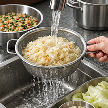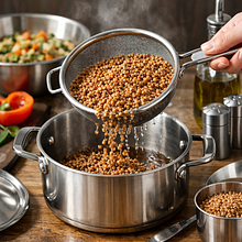 Cook the buckwheat. Rinse 200 g of dry buckwheat in a sieve under cold water. Transfer to a pot, add 400 ml of cold water (ratio 1:2) and a pinch of salt. Bring to a boil over high heat, then reduce to low heat and cook covered for 12–15 minutes until the buckwheat absorbs the water. After removing from heat, let it sit covered for 5 minutes, then fluff with a fork — the grains should be separate, soft, but not mushy.
