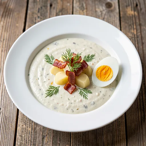 Horseradish soup is a classic Polish soup with a sharp, spicy aroma of horseradish, here served in a milder, creamy version with pieces of potato. It originates from regional cuisine, where horseradish was valued as a warming and preserving flavor addition. This version combines homemade broth, gently sautéed onion, and a roux with freshly grated horseradish, resulting in a distinct but not overwhelming taste. Serve with a boiled egg or crispy bacon to balance the spiciness; garnish with fresh dill. The soup is perfect as a first course for a family spring dinner when fresh horseradish is available, as well as for Easter as an alternative to borscht or sour rye soup.