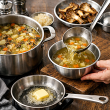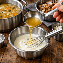 Remove 2-3 ladles of hot broth into a small bowl. In a separate small pan, melt 10 g of butter (from the remaining butter) and add flour, frying while stirring for 1.5-2 minutes over medium heat until the roux takes on a slightly nutty aroma and a light brown color. Slowly pour the reserved hot broth into the roux, whisking until a smooth mixture without lumps forms. Pour the roux back into the pot with the soup and mix well. Cook for 3-4 minutes to allow the flour flavor to integrate.