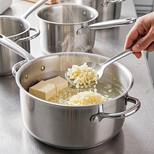 In a large pot with a capacity of about 3 liters, heat the butter over medium heat. Add the finely chopped onion and sauté for 3-4 minutes, stirring, until the onion becomes translucent and soft, but not browned. Sprinkle in the flour and stir with a wooden spoon for 1 minute, until the flour lightly combines with the butter and loses its raw taste — this will be a light roux.