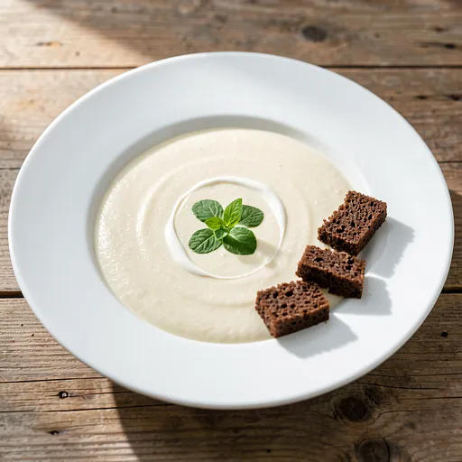 A delicate, velvety cream soup made from white vegetables, combining the root aromas of celery and parsley with the mild sweetness of leek and potato. This is a modern version of Polish vegetable soup — its smooth texture, subtle seasoning, and light creamy note make it suitable as an elegant starter for Easter dinner or a light spring dinner. Serve with crispy whole grain bread croutons or chopped sorrel for a contrast of freshness and color. The soup is hearty but not heavy; visually, it attracts with its creamy, light color accented by a green touch.