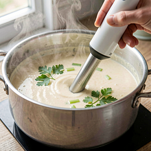 After cooking, turn off the heat. Use an immersion blender (recommended) directly in the pot: holding the blender upright, blend with up-and-down motions until you achieve a uniform, smooth cream (about 1–2 minutes). If you only have a countertop blender, transfer the soup in batches to the blender — fill it no more than 2/3 full and blend for 30–60 seconds on high speed. Be mindful of the steam — when blending in a countertop blender, hold a cloth over the lid and blend in short bursts.