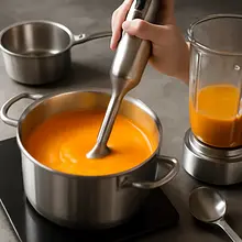Turn off the heat. Using an immersion blender in the pot (or transferring portions to a stand blender), blend the soup into a smooth cream — move the blender slowly up and down to avoid splattering the hot soup. The consistency is assessed after blending: the soup should be smooth and silky. If it is too thick, add warm broth or water in 50 ml increments until the desired consistency is reached. Add lemon juice and season with salt and pepper to taste. If you are using cream — pour it in now and mix thoroughly (heat on very low for 1-2 minutes, avoiding boiling). Taste and adjust the seasoning.