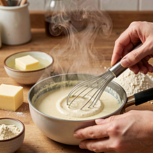 Prepare the roux: in a small pan, melt 10 g of butter over medium heat, add flour (20 g) and stir with a whisk or wooden spoon for 1.5–2 minutes until the flour is lightly browned but not burnt. Remove the pan from the heat. In a separate cup, scoop 150–200 ml of hot soup and slowly, while continuously stirring with a whisk, pour it into the roux until a smooth, liquid emulsion without lumps is formed. Pour this mixture back into the pot with the soup and cook everything for 2–3 minutes over low heat until the soup thickens slightly.