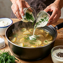In a bowl, mix the sour cream (200 g) with 3–4 tablespoons of hot soup (using a spoon to coat) to temper it and avoid curdling. Slowly pour the tempered sour cream into the pot, stirring constantly. Add chopped dill (about 2/3 of a bunch) and season with salt and freshly ground pepper to taste. Cook for another 1–2 minutes on very low heat — do not allow it to boil. Taste and add more pickle juice or salt if necessary.
