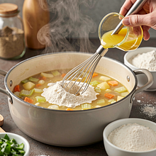 Add the flour to the vegetables and sauté for 1-2 minutes, stirring vigorously to eliminate the raw taste of the flour — a delicate roux will form. Then, pour in the hot vegetable broth in a thin stream, continuously stirring to avoid lumps.