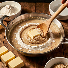 In a medium skillet, melt 30 g of butter over low heat. When the butter is lightly foaming, add 30 g of all-purpose flour and stir with a wooden spoon until a smooth, light brown roux forms — cook for 2–3 minutes to remove the raw taste of the flour, but do not let it burn.