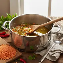 Do garnka z warzywami i przyprawami wsyp opłukaną czerwoną soczewicę. Wymieszaj wszystko dokładnie, aby soczewica pokryła się aromatyczną pastą. Następnie wlej 1.5 litra bulionu warzywnego. Zwiększ moc palnika i doprowadź zupę do wrzenia. Gdy zacznie wrzeć, zmniejsz ogień do minimum, przykryj garnek pokrywką (zostawiając małą szczelinę) i gotuj przez około 20-25 minut.