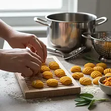 Aby nadać gnocchi charakterystyczny kształt, weź jednego kluseczka i delikatnie przesuń go po ząbkach widelca, lekko dociskając kciukiem. Z drugiej strony powstanie małe wgłębienie. Ten kształt sprawia, że sos idealnie przylega do klusek. Uformowane gnocchi odkładaj na tacę lub deskę obficie posypaną mąką, tak aby się nie stykały.