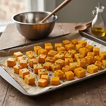 Wstaw blachę do nagrzanego piekarnika i piecz przez około 30-40 minut. Warzywa są gotowe, gdy dynia i ziemniaki są całkowicie miękkie (sprawdź wbijając widelec – powinien wchodzić bez oporu), a ich krawędzie są lekko zrumienione i skarmelizowane. W połowie pieczenia (po około 15-20 minutach) możesz przemieszać warzywa na blaszce, aby upiekły się równomiernie.
