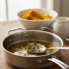 Na tej samej patelni rozgrzej pozostałą łyżkę oliwy. Kiedy oliwa będzie gorąca, ostrożnie połóż na niej listki szałwii, zachowując między nimi odstępy. Smaż przez około 15-30 sekund z każdej strony, aż staną się chrupiące i lekko przezroczyste. Wyjmij je łyżką cedzakową na talerz wyłożony ręcznikiem papierowym, aby odsączyć nadmiar tłuszczu. Lekko posól.