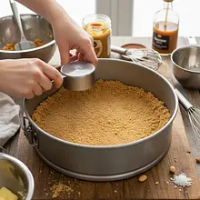 Przesyp pokruszone herbatniki z orzeszkami do miski. Wlej rozpuszczone masło i dokładnie wymieszaj całość za pomocą łyżki lub szpatułki, aż wszystkie okruszki będą wilgotne. Masa powinna przypominać mokry piasek i zlepiać się po ściśnięciu w dłoni.