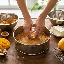 Masę herbatnikową przełóż do przygotowanej tortownicy. Równomiernie rozprowadź ją po całym dnie, a następnie bardzo dokładnie dociśnij do dna za pomocą spodu szklanki lub łyżki. Stwórz równą, zwartą warstwę. Wstaw tortownicę do lodówki na co najmniej 30 minut, aby spód stwardniał.