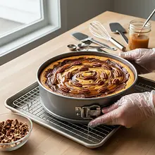Wyjmij schłodzony sernik z lodówki. Ostrożnie przejedź cienkim nożem wzdłuż brzegów formy, aby oddzielić ciasto od obręczy, a następnie delikatnie ją zdejmij. Wylej ciepłą masę kajmakową na wierzch sernika i rozprowadź równomiernie szpatułką lub łyżką, pozwalając jej fantazyjnie spłynąć po bokach. Posyp całość gruboziarnistą solą morską i udekoruj orzechami pekan. Podawaj od razu lub przechowuj w lodówce.