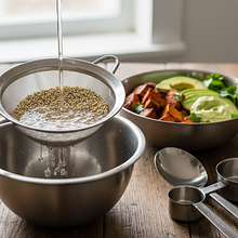 W czasie gdy bataty się pieką, przygotuj komosę. Wsyp quinoę na drobne sitko i bardzo dokładnie płucz pod zimną, bieżącą wodą przez około 1-2 minuty, mieszając ją dłonią. Ten krok jest kluczowy, aby usunąć naturalnie występujące saponiny, które nadają gorzki smak. Odcedź dokładnie.