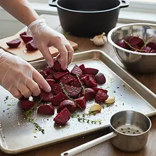 Rozgrzej piekarnik do 200°C (termoobieg). Buraki dokładnie wyszoruj pod bieżącą wodą, ale nie obieraj ich ze skórki ani nie odcinaj końcówek - to zapobiegnie utracie soku i koloru. Osusz je ręcznikiem papierowym.
