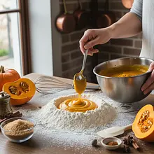 Upieczoną dynię lekko ostudź, a następnie oddziel miąższ od skórki za pomocą łyżki (jeśli używasz dyni hokkaido, skórka jest jadalna i możesz ją zmiksować razem z miąższem). Ugotowane ziemniaki odcedź, lekko przestudź i obierz ze skórki. Zarówno gorący miąższ dyni, jak i gorące ziemniaki przeciśnij przez praskę do ziemniaków lub dokładnie rozgnieć tłuczkiem na gładką masę. Rozłóż purée na blacie lub dużej desce, aby odparowało jak najwięcej wilgoci.