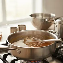 W małym rondelku z grubym dnem umieść biały cukier. Podgrzewaj na średniej mocy, nie mieszając, aż cukier zacznie się topić i przybierać bursztynowy kolor na brzegach. Wtedy możesz delikatnie poruszać rondelkiem, aby cukier topił się równomiernie. Gdy cały cukier się rozpuści i uzyska kolor jasnego bursztynu, zdejmij rondelek z ognia. BARDZO OSTROŻNIE dodaj 30g masła (pokrojonego w kostkę) i energicznie wymieszaj rózgą - masa będzie mocno bulgotać! Następnie, ciągle mieszając, wlej powoli śmietankę kremówkę. Postaw z powrotem na mały ogień i gotuj przez około minutę, aż sos będzie gładki. Zdejmij z ognia, dodaj solidną szczyptę soli i wymieszaj. Odstaw do lekkiego przestudzenia.