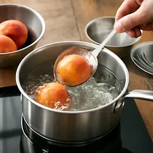 Wrzuć brzoskwinie do wrzącej wody na 30-40 sekund — skórka powinna lekko pęcznieć. Wyjmij je natychmiast łyżką cedzakową i przełóż do miski z lodowatą wodą na 1 minutę, aby zatrzymać proces gotowania. Po schłodzeniu skórka powinna łatwo odchodzić pod palcami — zdejmij skórkę.