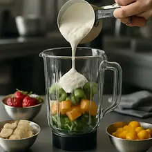 Odmierz jogurt grecki (200 g) i sok pomarańczowy (200 ml) do dzbanka lub dużej miarki. Wyciśnij sok z limonki (15 g, około 1 łyżka) bezpośrednio do dzbanka. Jeśli planujesz dodać nasiona chia i chcesz, żeby napęczniały, odmierz 20 g nasion chia i zalej je 50 ml wody w małej miseczce — odstaw na 10 minut, aż zrobi się żel (opcjonalne).