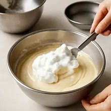 Wsyp przesianą mąkę z proszkiem do pieczenia i szczyptą soli do masy żółtkowej. Mieszaj od środka na zewnątrz delikatnymi ruchami szpatułki, aż nie będzie widać surowej mąki — krótkie, delikatne ruchy. Konsystencja powinna być gęstsza niż naleśnikowe ciasto, ale płynna. Jeśli wyda się zbyt gęste, dodaj pozostałe mleko po łyżce do osiągnięcia odpowiedniej konsystencji.