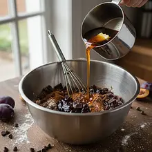 W drugiej, mniejszej misce połącz wszystkie mokre składniki. Wbij jajka i roztrzep je lekko widelcem. Następnie dodaj mleko, olej rzepakowy oraz powidła śliwkowe. Całość wymieszaj energicznie trzepaczką, aż uzyskasz jednolitą, gładką masę o płynnej konsystencji.