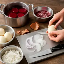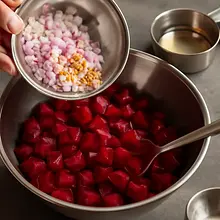 Jeśli masz buraki surowe: umyj je dokładnie pod bieżącą wodą, obetnij liście i korzeń tak, by nie uszkodzić skórki. Włóż buraki do dużego garnka tak, by miały miejsce (nie układaj warstw zbyt ciasno). Zalej zimną wodą tak, aby woda przykrywała buraki około 2 cm ponad ich powierzchnię. Dodaj 5 g soli. Doprowadź do wrzenia na dużym ogniu, po zagotowaniu zmniejsz ogień do średnio-niskiego i gotuj 40–60 minut w zależności od wielkości (mniejsze 30–40 min, większe nawet 60+). Sprawdź wkłuwając widelec lub nóż w największy burak: jeśli nóż wchodzi gładko aż do środka, buraki są miękkie i gotowe.
