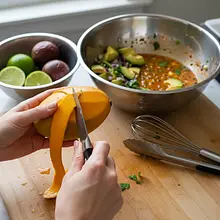 Przygotuj pikantną marynatę. Przekrój limonki na pół i wyciśnij z nich sok do szklanej lub ceramicznej miski. Następnie przekrój marakuje na pół i za pomocą małej łyżeczki wydrąż cały miąższ wraz z pestkami prosto do soku z limonki. Papryczkę chili umyj, odkrój ogonek, przekrój wzdłuż na pół i za pomocą czubka noża usuń nasiona oraz białe błonki (to w nich jest najwięcej ostrości). Następnie posiekaj papryczkę w bardzo drobną kosteczkę i dodaj do miski. Wszystko dokładnie wymieszaj widelcem.