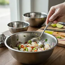 Spróbuj ceviche i dopraw do smaku solą. Podawaj natychmiast w schłodzonych miseczkach lub kieliszkach koktajlowych. Obok ułóż chrupiące chipsy z batatów, które będą służyć jako jadalne 'łyżeczki'. Dodatkowo, jeśli używasz, posyp danie prażonymi ziarnami kukurydzy dla dodatkowej chrupkości.