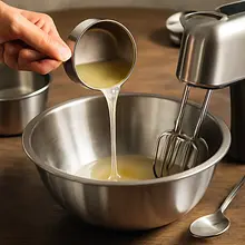 Schłodź aquafabę i miskę: wstaw 240 ml aquafaby do lodówki na 15–20 minut przed ubijaniem. Schłodzona aquafaba szybciej się spienia i daje stabilniejszą pianę. Jeśli masz misę metalową lub szklaną, włóż ją na chwilę do lodówki — zimne naczynie pomaga w ubijaniu.