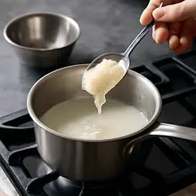 Podgrzej żelatynę: przełóż napęczniałą żelatynę z mlekiem do małego rondelka i podgrzewaj na bardzo małym ogniu, ciągle mieszając, aż żelatyna całkowicie się rozpuści i płyn będzie klarowny (ok. 30–60 sekund). Uważaj, żeby nie doprowadzić do wrzenia — wystarczy temperatura, przy której para lekko faluje.
