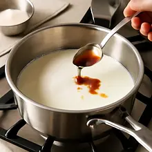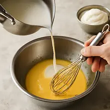 Wlej powoli około 2–3 łyżek gorącego mleka do masy żółtkowej, energicznie mieszając (temperowanie), aby podnieść temperaturę żółtek. Następnie wlej całą masę żółtkową z powrotem do rondelka z resztą mleka i gotuj na małym ogniu, ciągle mieszając trzepaczką, aż krem zgęstnieje i zacznie lekko bulgotać (ok. 1–2 minut po zgęstnieniu).