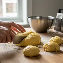 Powoli wlej mieszankę mokrych składników do wgłębienia zrobionego w mące. Używając widelca lub łyżki, zacznij delikatnie mieszać, stopniowo zagarniając mąkę z brzegów do środka, aż do połączenia wszystkich składników w jedną, zbitą, lekko lepiącą się kulę ciasta. Nie przejmuj się, jeśli na tym etapie ciasto wygląda na twarde i niejednolite.