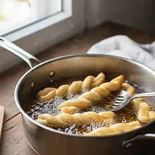 W szerokim, płaskim garnku lub na głębokiej patelni rozgrzej olej. Powinno być go na tyle dużo (minimum 3-4 cm głębokości), aby faworki mogły w nim swobodnie pływać. Olej musi osiągnąć temperaturę około 175-180°C. Aby to sprawdzić bez termometru, wrzuć mały skrawek ciasta - jeśli natychmiast wypłynie na powierzchnię i zacznie się intensywnie smażyć, tworząc wokół siebie mnóstwo bąbelków, olej jest gotowy.
