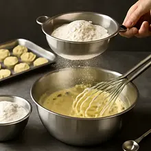 Przesiej mąkę (300 g) z solą (1 g) do osobnej miski. Dodaj ją do masy maślanej w dwóch porcjach. Najpierw dodaj połowę mąki i wymieszaj na niskich obrotach miksera lub drewnianą łyżką — mieszaj tylko do momentu, aż przestanie być widać sucha mąka (ok. 20–30 sekund). Dodaj drugą połowę i połącz krótko (15–30 sekund), kończąc mieszanie szpatułką tak, by ciasto było jednolite. Ciasto powinno być zwarte, nie lepić się nadmiernie do rąk, dać się zebrać w kulę.
