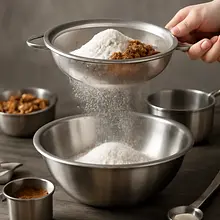 W misce do przesiania umieść mąkę, kakao, proszek do pieczenia i sól. Przesiej składniki razem co najmniej dwa razy — dzięki temu mieszanina będzie równa, bez grudek i lepiej napowietrzona.
