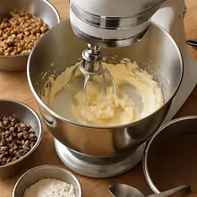 W osobnej dużej misce umieść miękkie masło i cukier. Używając miksera z końcówką do ucierania lub drewnianej łyżki, utrzyj masło z cukrem przez 3–4 minuty na średnich obrotach, aż masa stanie się jaśniejsza, puszysta i lekko kremowa — gdy podniesiesz końcówkę miksera, masa powinna tworzyć miękkie szczyty.