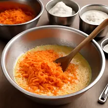 Zetrzyj marchew na tarce o drobnych oczkach bezpośrednio do dużej miski. Gdy marchew jest starta, odciśnij nadmiar bardzo płynnej soku (jeśli marchew jest bardzo soczysta) przy pomocy ściereczki kuchennej — jednak pozostaw wilgoć, która nada ciastu miękkość.