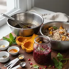 Tuż przed podaniem, ponownie wstrząśnij słoikiem z sosem i polej sałatkę przygotowanym winegretem. Jeśli używasz, posyp całość świeżymi, rubinowymi pestkami granatu dla dodatkowej chrupkości, koloru i soczystości. Podawaj natychmiast, póki dynia i komosa są jeszcze ciepłe.