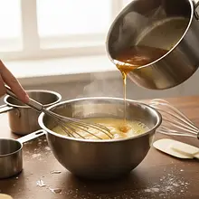 W małej miseczce roztrzep jajka widelcem do połączenia żółtek z białkami. Do gorącej masy miodowej, ciągle mieszając energicznie trzepaczką, wlewaj powoli cienkim strumieniem roztrzepane jajka. Szybkie mieszanie zapobiegnie ścięciu się jajek. Gotuj masę w kąpieli wodnej jeszcze przez 2-3 minuty, aż lekko zgęstnieje. Zdejmij miskę z garnka.