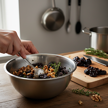 Przygotuj farsz. Posiekaj grubo orzechy włoskie i suszone śliwki. W miseczce wymieszaj je razem. Rozłóż przygotowany farsz równomiernie na wewnętrznej powierzchni płata mięsa. Następnie zwiń polędwicę z powrotem w ciasny rulon. Zwiąż roladę w kilku miejscach sznurkiem kuchennym, aby utrzymała kształt podczas pieczenia.