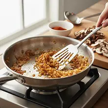 Gdy cebula będzie gotowa, zmniejsz ogień do minimum. Dodaj słodką paprykę i energicznie mieszaj przez około 30 sekund. Uważaj, aby jej nie przypalić! Następnie dodaj 20g mąki pszennej (ok. 2 łyżki) i smaż, ciągle mieszając, przez kolejną minutę. W ten sposób stworzysz tradycyjną czeską zasmażkę (zásmažka), która zagęści gulasz.
