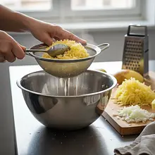 To najważniejszy krok dla chrupkości placków. Przełóż starte ziemniaki na gęste sito lub gazę i bardzo dokładnie odciśnij nadmiar wody, mocno ugniatając masę rękoma. Wodę, która zebrała się w misce, odstaw na chwilę, a następnie delikatnie wylej, pozostawiając na dnie gęstą, białą skrobię. Odciśnięte ziemniaki przełóż z powrotem do miski ze skrobią.
