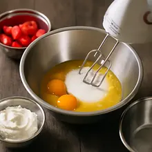 Do dużej, czystej i suchej miski włóż 240 g jajek i 200 g cukru. Ubijaj mikserem ręcznym lub stojącym na wysokich obrotach około 8-10 minut aż masa stanie się bardzo jasna, gęsta i podwoi-trzykrotnie objętość. Masa powinna tworzyć na powierzchni wstążkę (tzw. 'ribbon stage') gdy podniesiesz końcówki miksera.