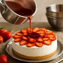 Gdy truskawkowy sos z żelatyną osiągnie temperaturę letnią (ok. 30-35°C), wylej go cienkim strumieniem na środek wierzchu tortu, pozwalając, aby sam spływał na boki i tworzył delikatne 'fala'. Ułóż na wierzchu połówki truskawek (odłożone 150 g) i, jeśli używasz, posyp brzegi uprażonymi płatkami migdałowymi.